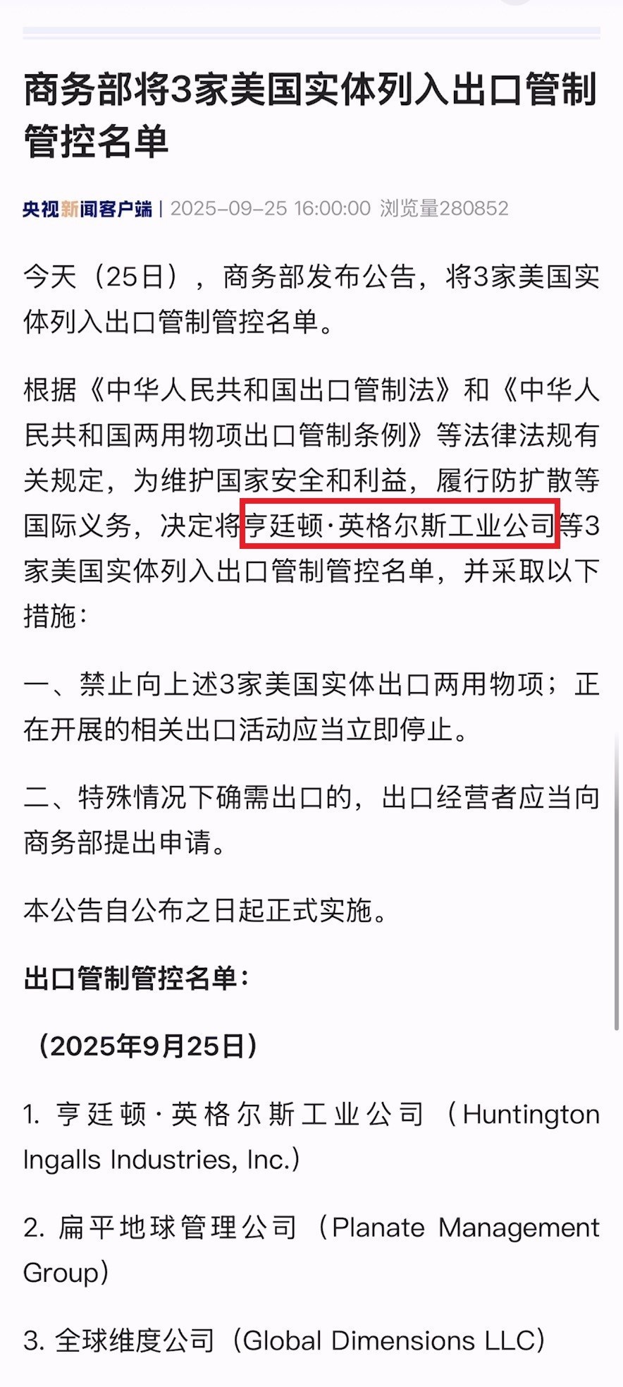 福建舰弹射成功消息官宣的第三天,咱们商务部突然宣布把3家美国实体列入出口管制管控名单,其中第一个就是美国唯一航母建造商亨廷顿·英格尔斯工业公司。根据公告,我方禁止向这3家美国实体出口两用物项;正在开展的相关出口活动应当立即停止。CNN等美媒纷纷以突发新闻形式报道此事,并认为这将导致美国唯一的航母生产链被“阻断”。美媒特别强调,东大的本次制裁发生在五角大楼正加班加点研究如何应对福建舰之际,不由得让外界猜测,东大是不是针对美军的“优势区域”使出了反制组合拳。首先,福建舰弹射成功消息的官宣,意味着东大在电磁弹射技术的实际应用方面已领先美军。如果美国海军不能及时应对,未来可能出现福特号航母只能出动四代舰载机去PK东大五代舰载机的窘境。其次,最新消息显示,五角大楼正在要求军方以超常规速度完成福特号弹射F-35C舰载机的工作。而这有赖于建造商亨廷顿·英格尔斯工业公司的全面配合。在这个节骨眼上东大宣布对该公司实施两用物项出口管制管控,显然会影响其研发和工程建造效率。美媒认为,这种“卡脖子”时机的巧妙选择以往是美国擅长的,如今自己却遭遇了“回旋镖”,对五角大楼来说可谓雪上加霜。最后,有鉴于福特号航母在服役后遇到的种种问题都与设计缺陷有关,亨廷顿·英格尔斯工业公司正在根据五角大楼的要求,对其二号舰肯尼迪号进行紧锣密鼓的改进和建造。在这个关键阶段,公司对于稀土等关键矿产的需求绝不能中断。而在东大宣布出口管制管控后,美方唯一能够依靠的只剩自家库存。但是显然,仅靠库存是无法完成肯尼迪号航母的建造交付的。至于剩下两家被管制管控的美国实体,分别是扁平地球管理公司和全球维度公司,均涉及美对台军售,一个主攻军事设施和工程建造,另一个则是军用光电、红外等传感器供应商。
